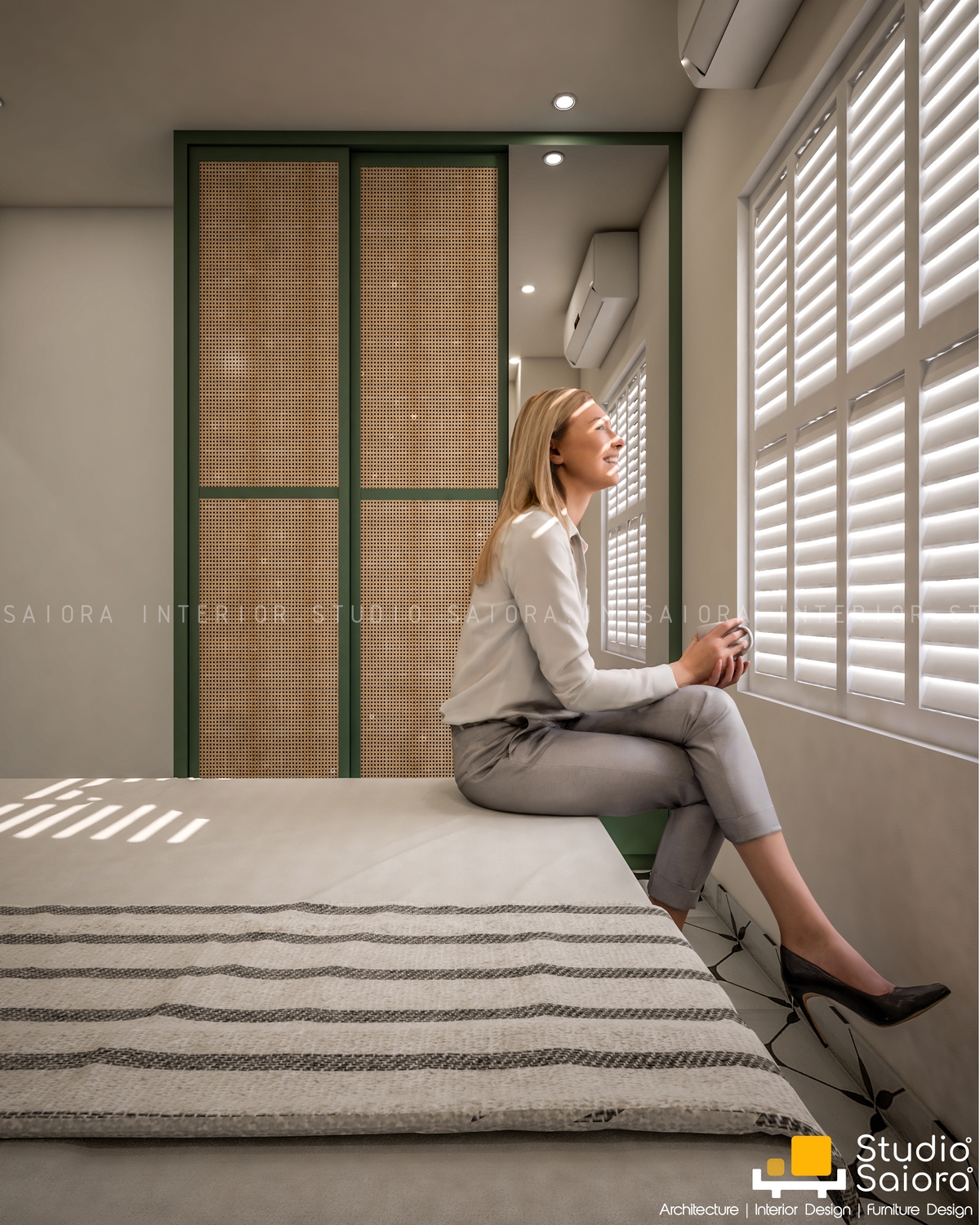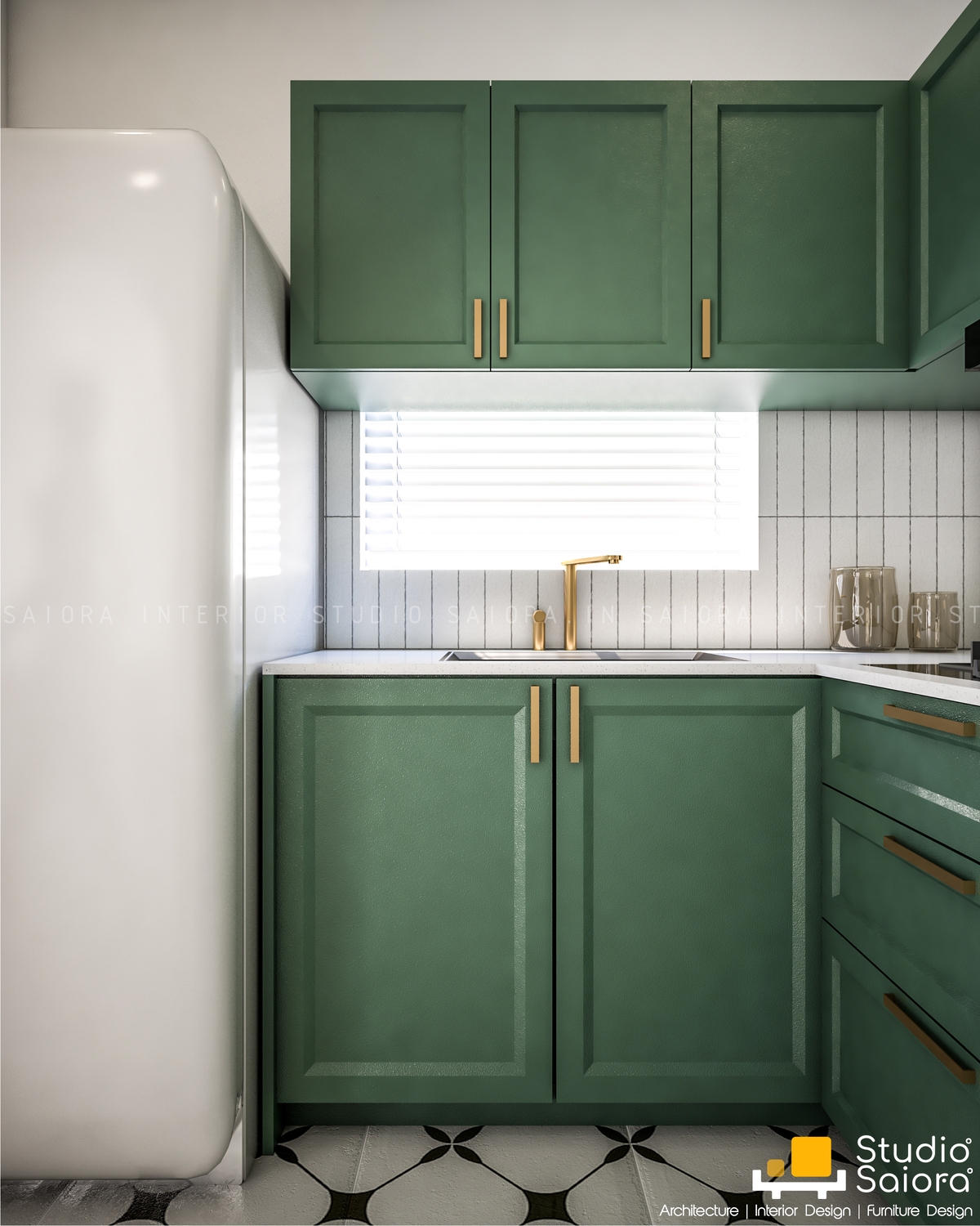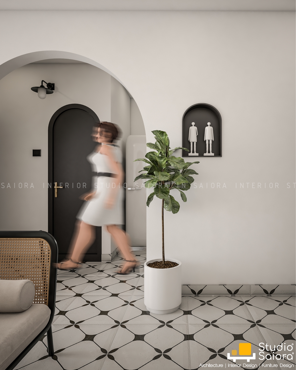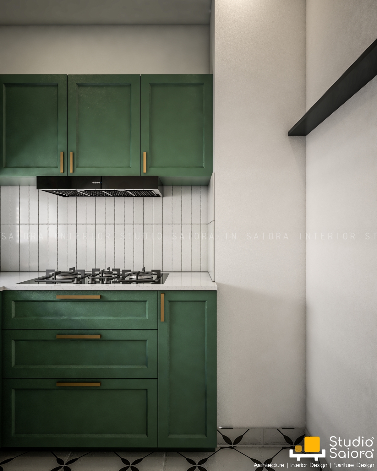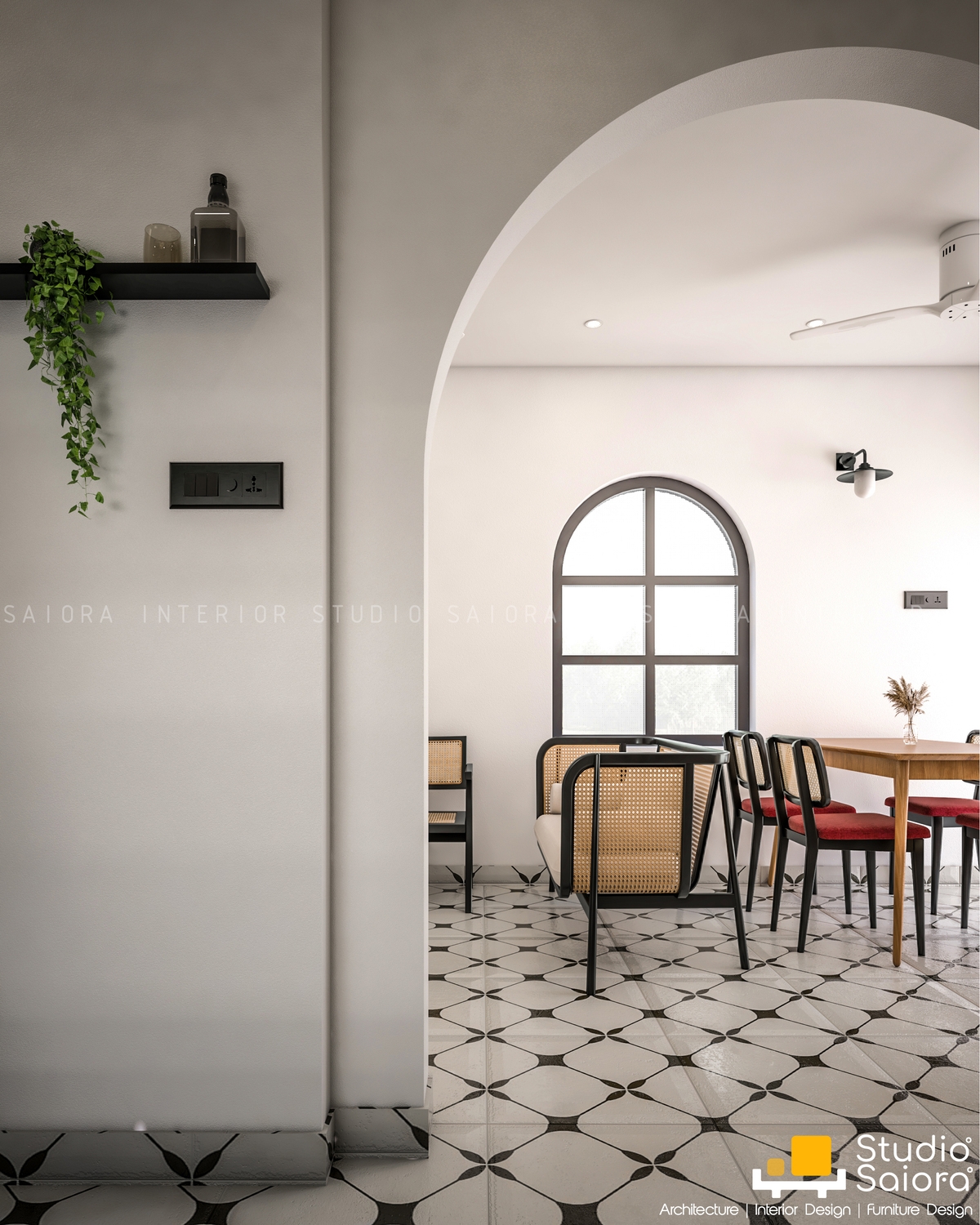 This 500 sq.ft. city apartment in Kakkanad, Kochi, designed for software couple Joy and Reji, stands out as one of Studio Saiora’s most aesthetically distinct and creatively versatile projects. Breaking away from typical layouts, the design blends minimalism with curated aesthetics—featuring black-and-white color tones, natural cane furniture, Moroccan patterned floor tiles, and a soft accent of green in the kitchen cabinetry. Arched openings in doors, windows, and walls added a sculptural quality to the space, setting it apart from conventional urban apartments. Vintage lamps in matching tones further enhanced the cohesive design narrative. Though compact in size, this home delivers an artistic and functional interior that feels open, expressive, and deeply personal. For those seeking aesthetic interior design ideas, minimal apartment inspiration, or unique compact home solutions in Kerala, this project reflects Studio Saiora’s ability to bring beauty and detail to even the smallest of spaces.