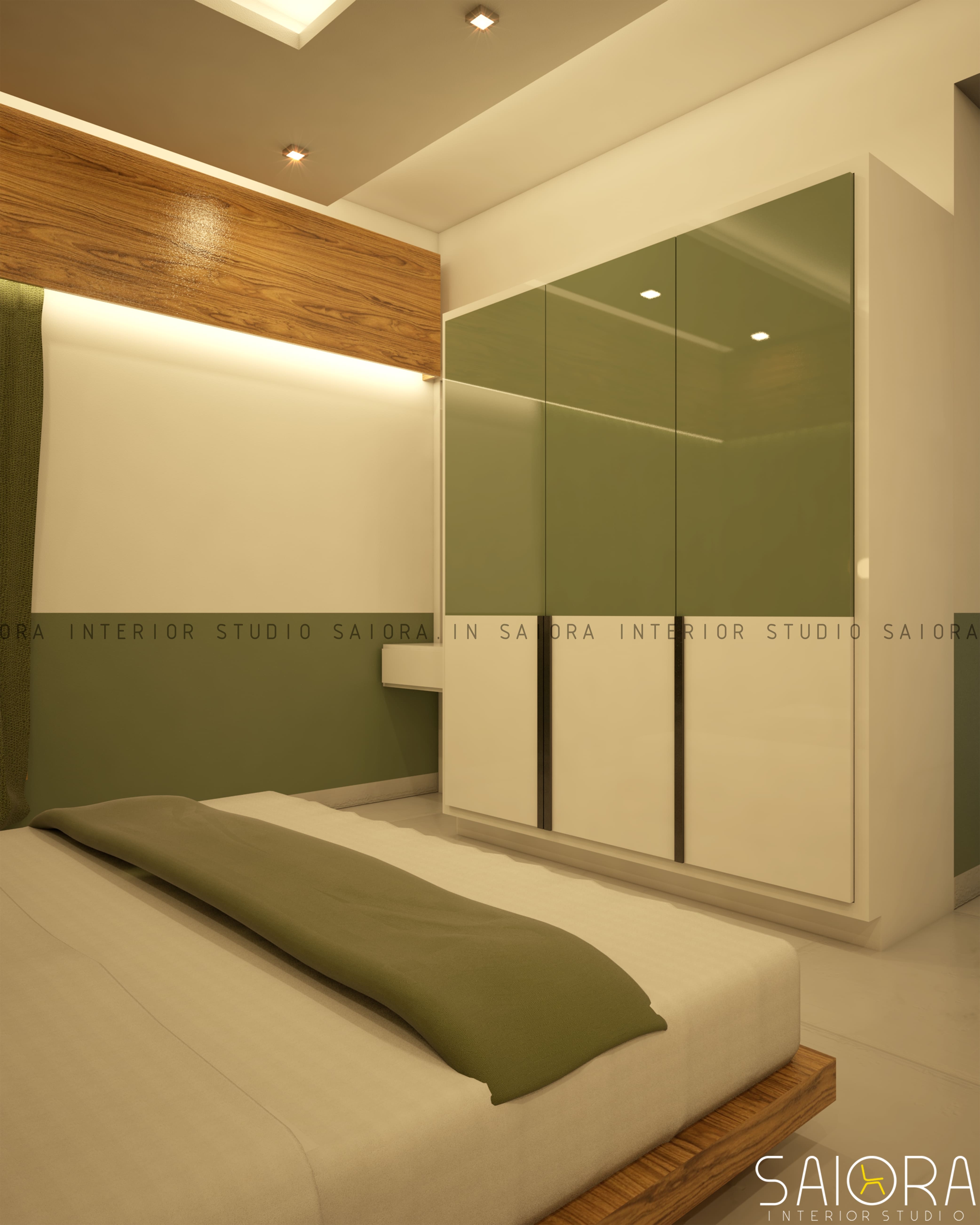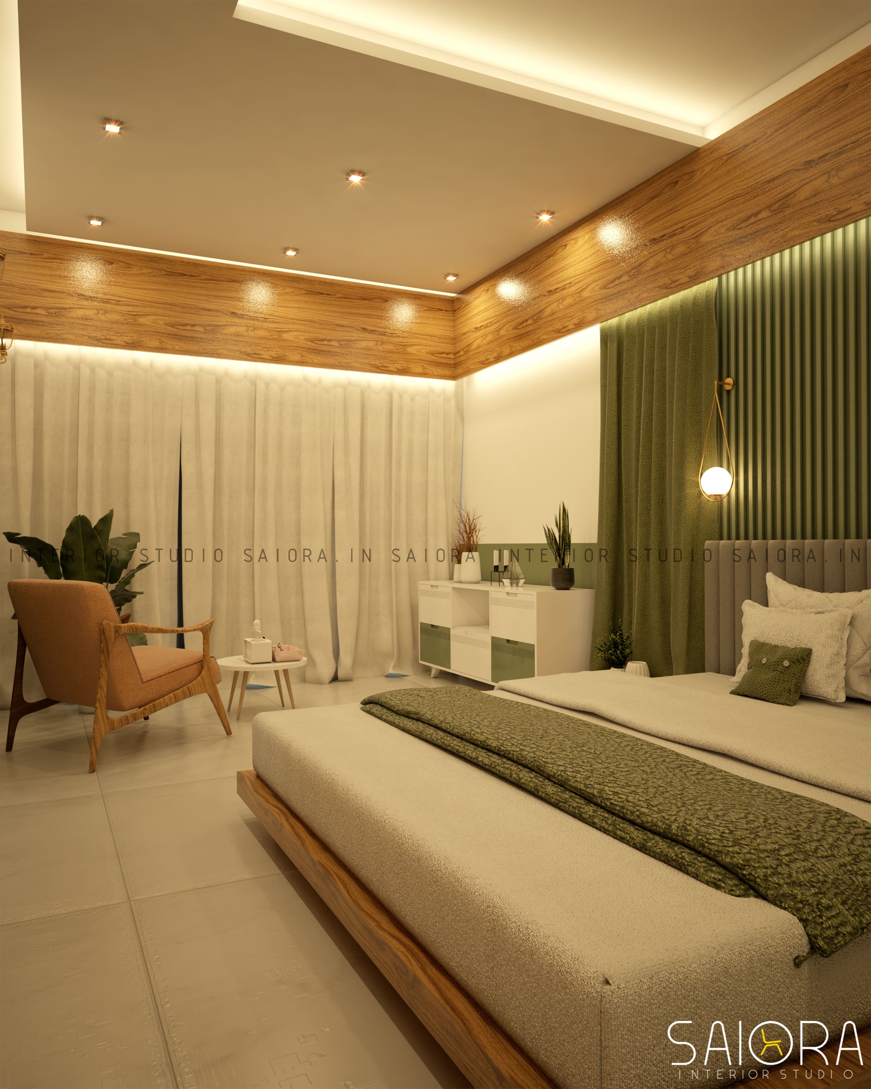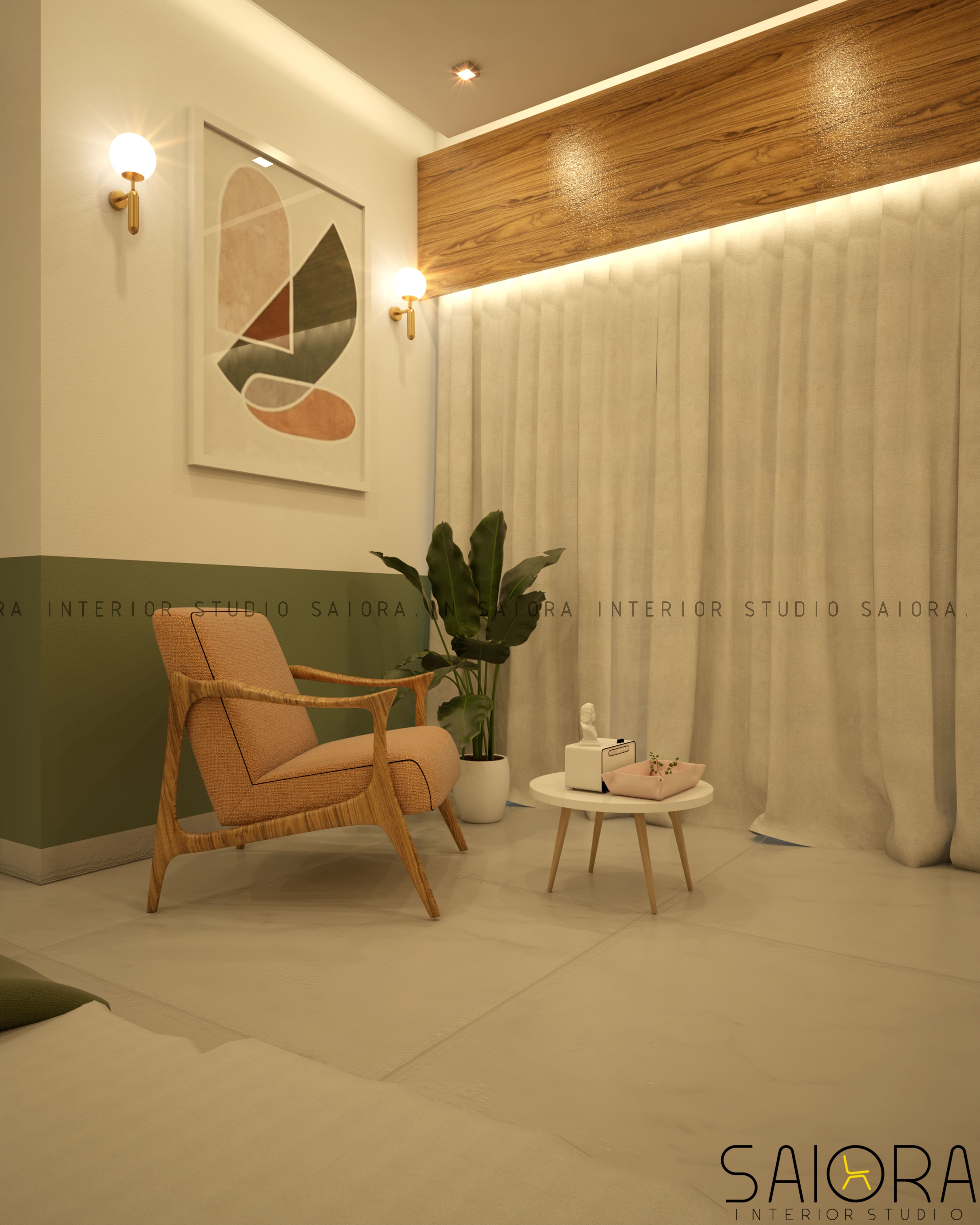 This 335 sq.ft. bedroom renovation in Mampuram, Malappuram, was designed by Studio Saiora for a young groom working abroad, looking for a simple yet stylish space for his visits home. With a full front-facing glass wall inviting natural light, the design focused on clean lines, neutral tones, and smart use of space. The room features half-painted earthy walls, custom wooden pelmets, a low-height bed, and ambient lamps that enhance coziness. A compact reading nook with an aesthetic sofa adds both comfort and charm. This project reflects our signature approach to budget-friendly groom bedroom interiors—perfect for small homes, NRIs, and young homeowners seeking simple, functional design ideas in Kerala, especially Malappuram, Kochi, and Ernakulam.